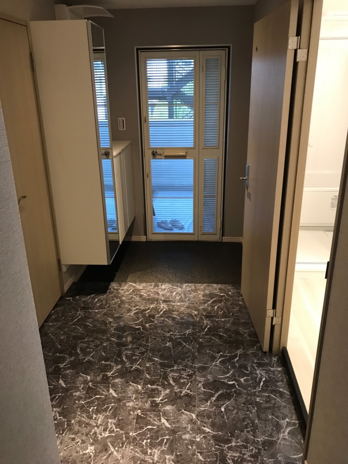 【玄関】床・壁・下駄箱 新品に入れ替え。デザイン性を感じる第一印象のお部屋