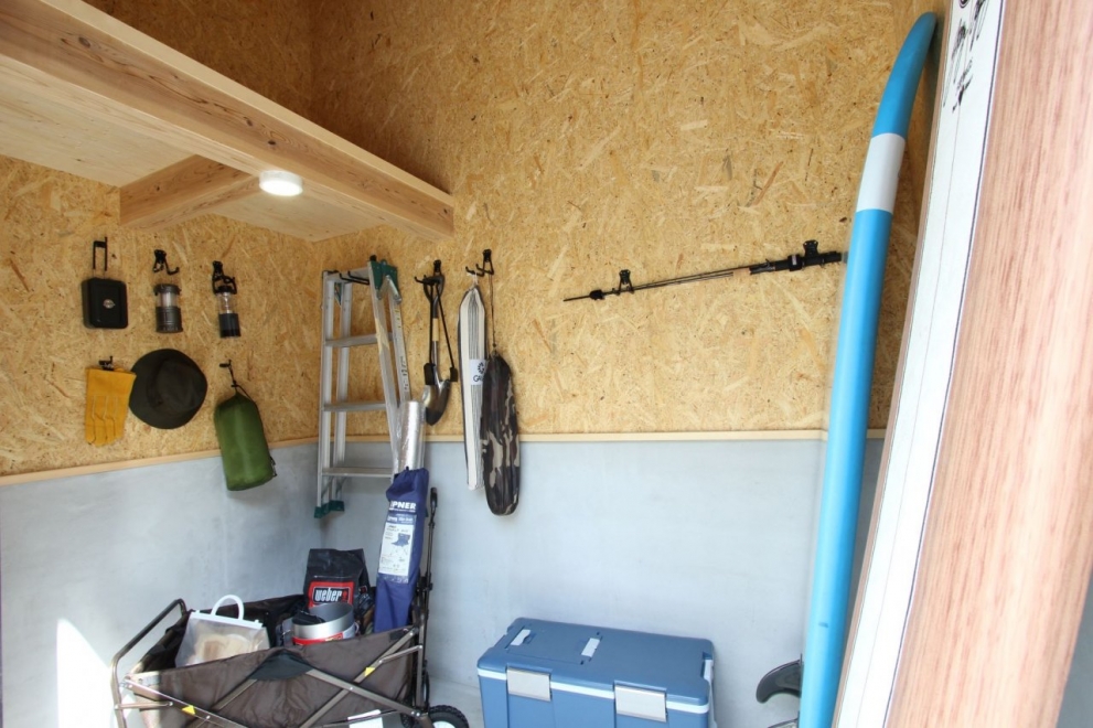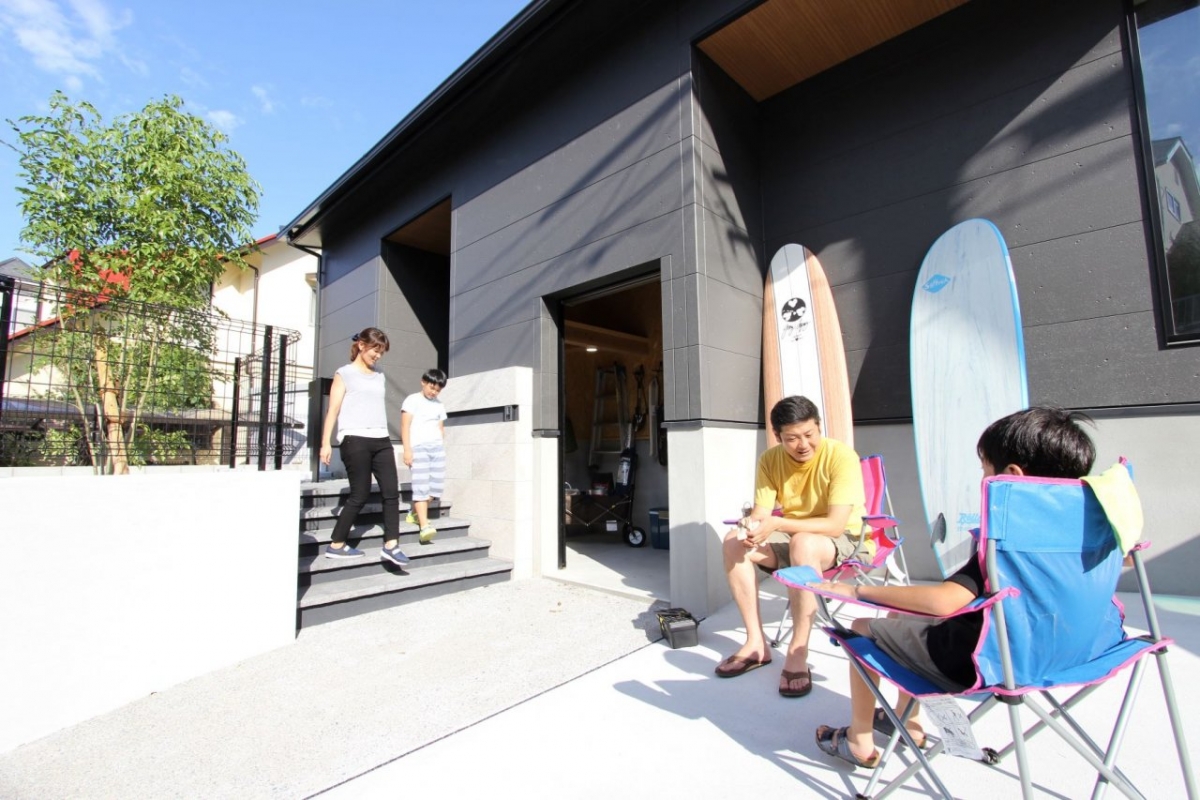 外には電動シャッター付きのアウトドアガレージを設け、アウトドア用品の収納や作業場として使えるスペースを設けました。アクティブなファミリーにピッタリのお家です。